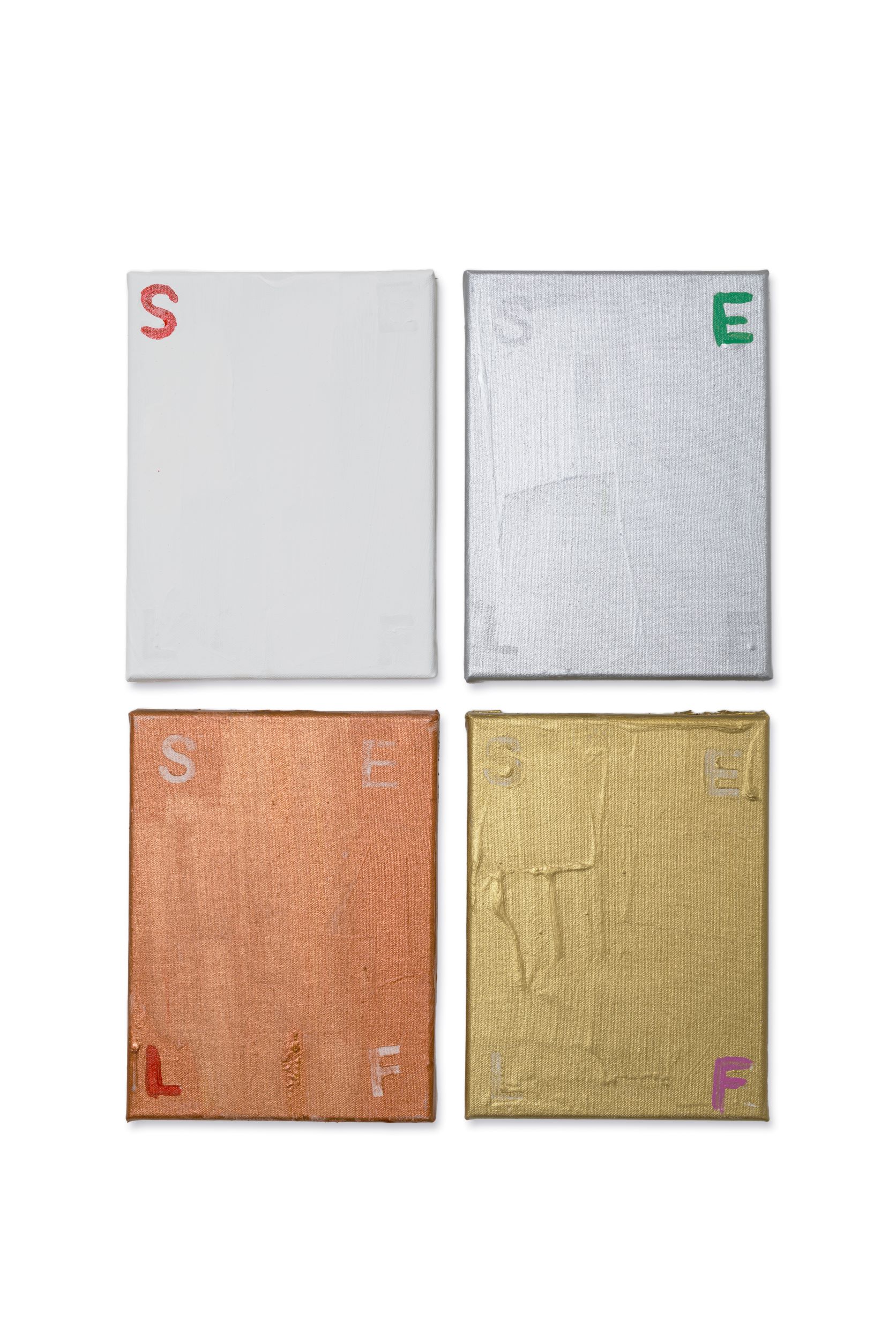 Self (2021) series is part of the wide artistic research of Chiara Dynys around the concept of identity. The work also recalls the mirror, emblem of self-representation and trap, according to the artist, in which often seeing oneself does not mean recognizing oneself. Self was born from these premises and has its roots in the originsof Dynys’ work: painting. The canvases are made throughdense material brushstrokes of gold, silver, titanium and copper. Eachelement of the multiple contains a letterof the word “Self”,subsequently recomposed through the use of color, different for each letter in each painting. Only the 4 canvases together areable to constitute one of the units of the work. Each multiplebecomes a metaphorical, abstract, essential mirror and each of itsof its variants presents unique, different characteristics: 100possible solutions of the self.